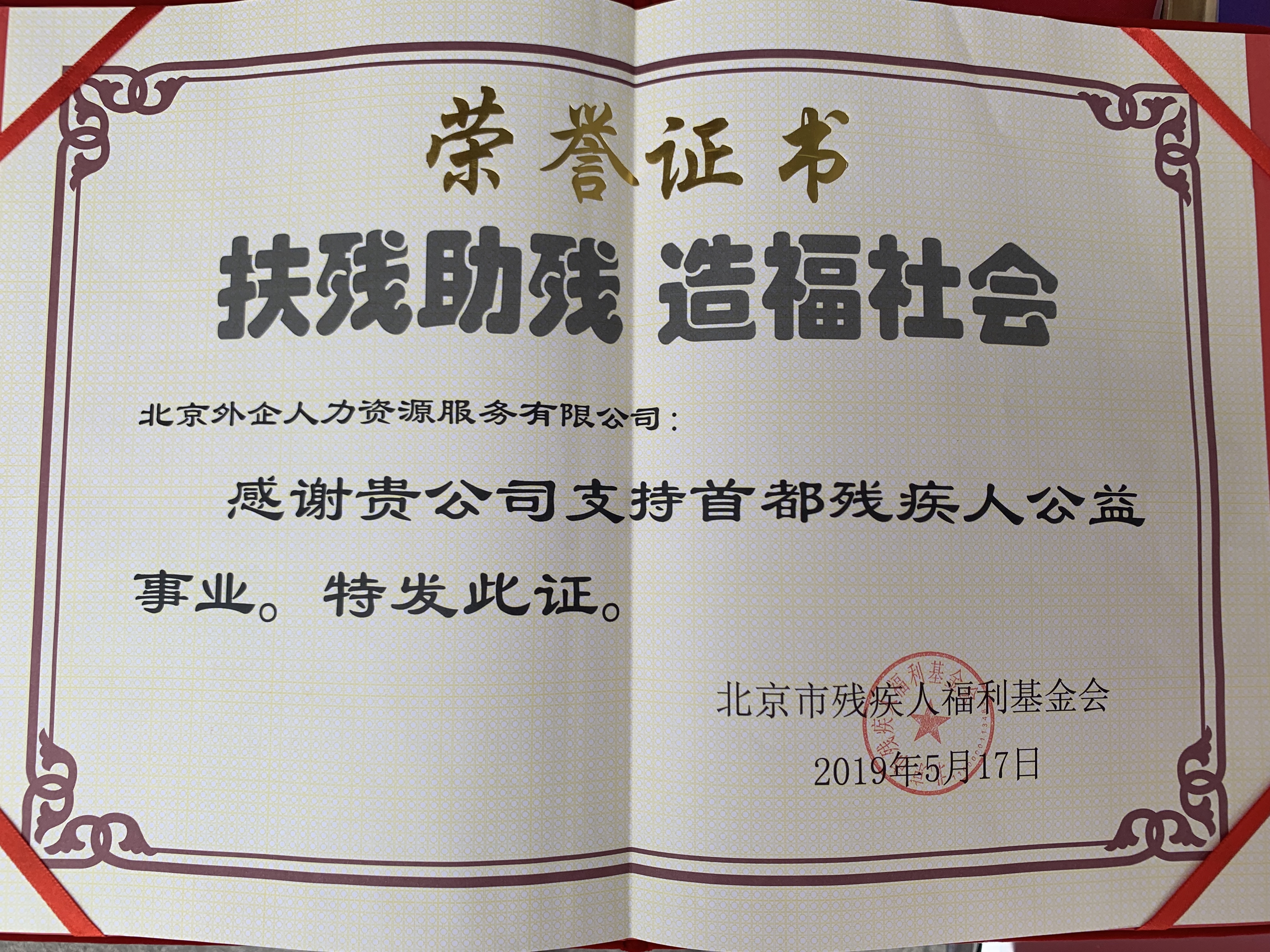 颁发单位:北京市残疾人福利基金会